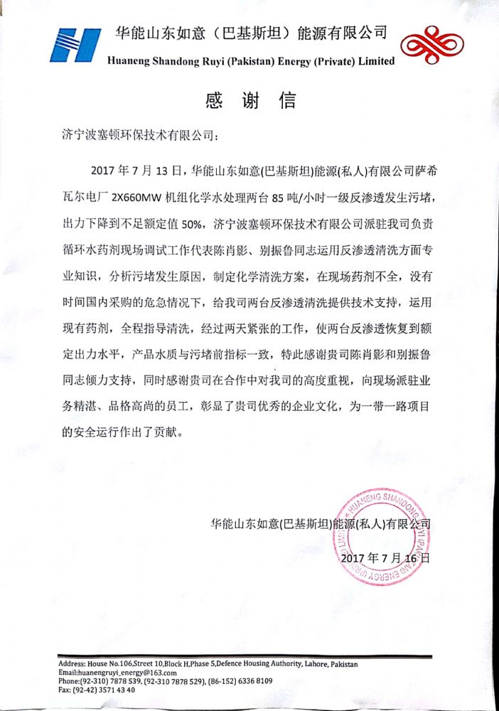 華能山東如意(巴基斯坦)能源有限公司感謝我公司陳肖影與別振魯同志在工作中的突出表現(xiàn) 2017-7-31 本文被閱讀 4477 次
